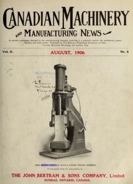 During WW1, the firm built equipment to manufacture armaments. Bertram & Sons advanced into producing large-scale machinery, including specialty equipment for mining and hydro-electric projects. The business also manufactured enormous pieces of machinery for their own use—one particular steam hammer was used for close to sixty years.