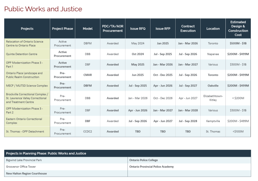 Projects that have entered procurement or construction phases since last year include the Quinte Health Prince Edward County Memorial Hospital redevelopment, the Weeneebayko Area Health Authority’s new hospital and the Scarborough subway extension.